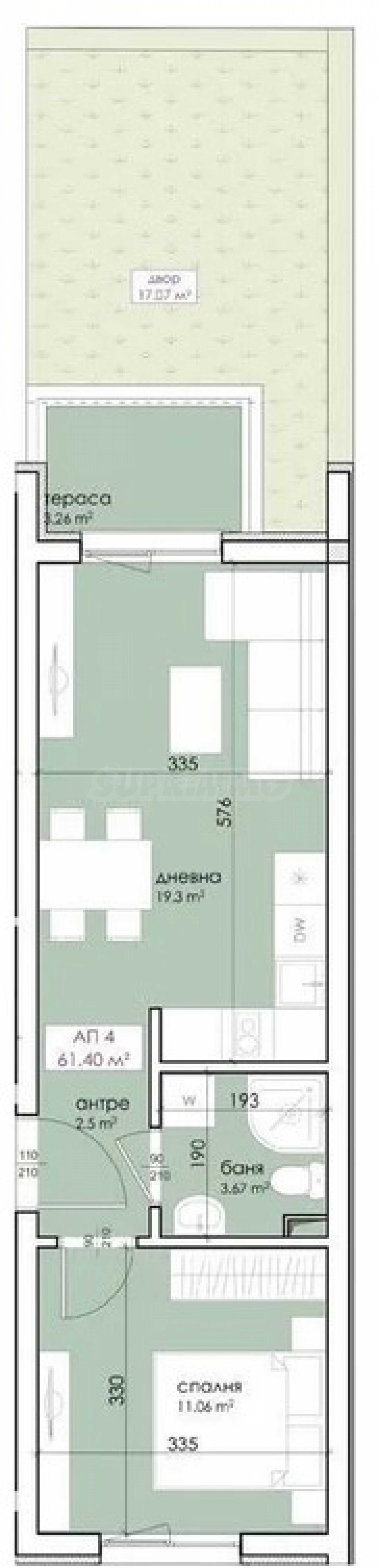Имотите са от тип студиа и двустайни апартаменти. На всеки етаж са разположени само по 4 имота.