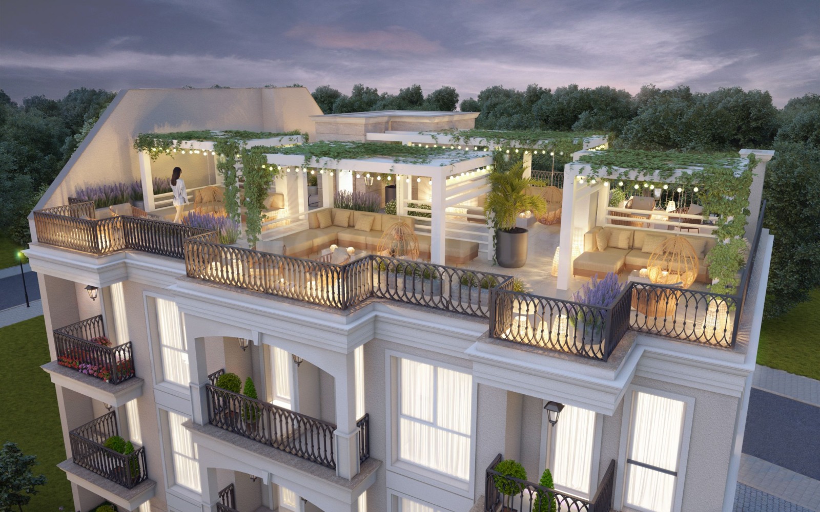 Собствениците на апартаментите на третия етаж ще разполагат с право на ползване и ексклузивен достъп с асансьор с чип до частни открити летни тераси. Терасите служат като лаундж зони, подходящи за слънчеви бани, приятни вечери и релакс на фона на звездното небе. Ще има предвидена възможност за изграждане на кът за барбекю и лятна кухня.