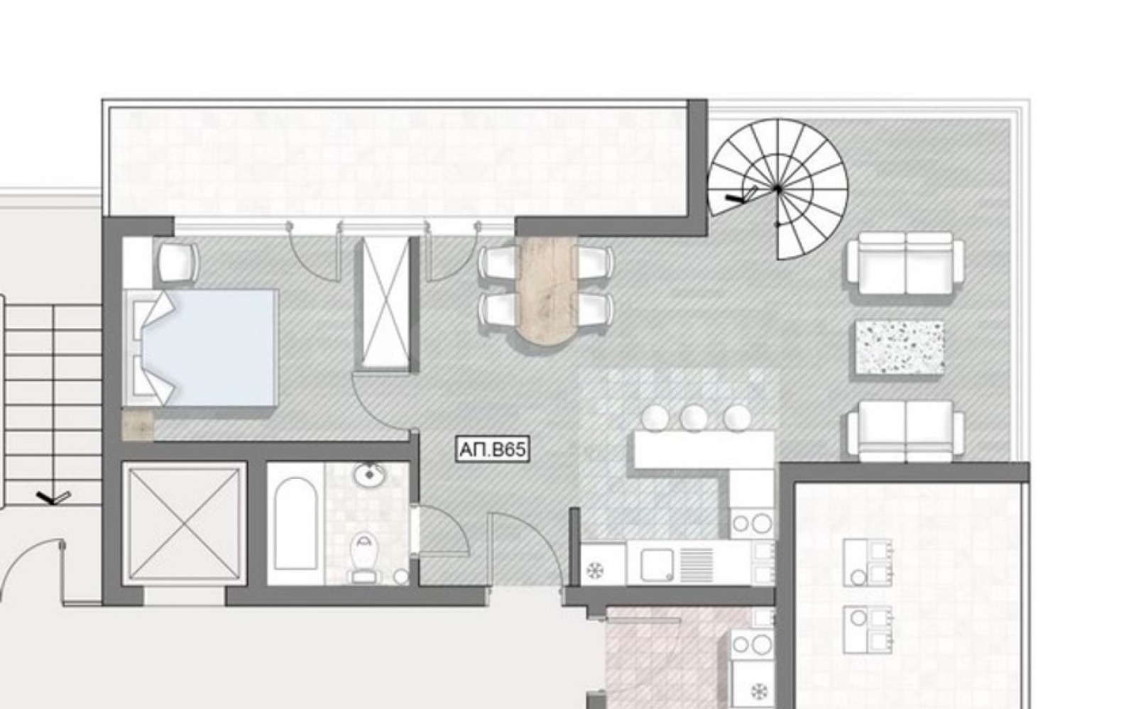 Имотът от 108.02 кв.м е разпределен на две нива и има изложения на изток, юг и запад. Състои се от всекидневна, спалня, тераса, баня с тоалетна на първо ниво и втора спалня на ниво две. Предлага се 'до ключ', без мебели. Има възможност и за обзавеждане.