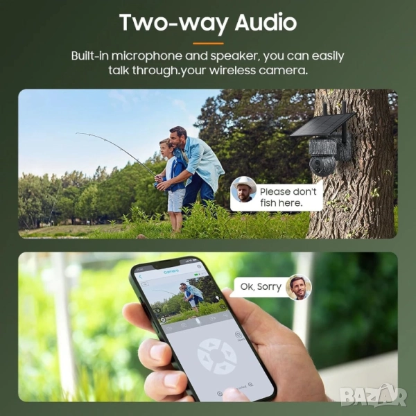 Камуфлажна безжична 8MP PTZ соларна камера 4G SIM със слънчев панел Двупосочна аудио