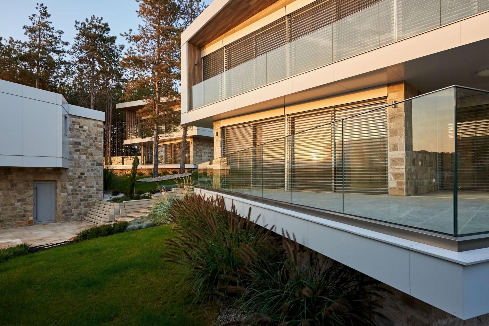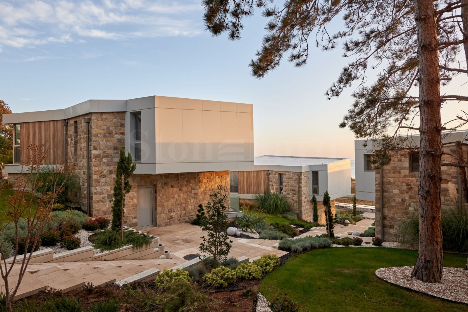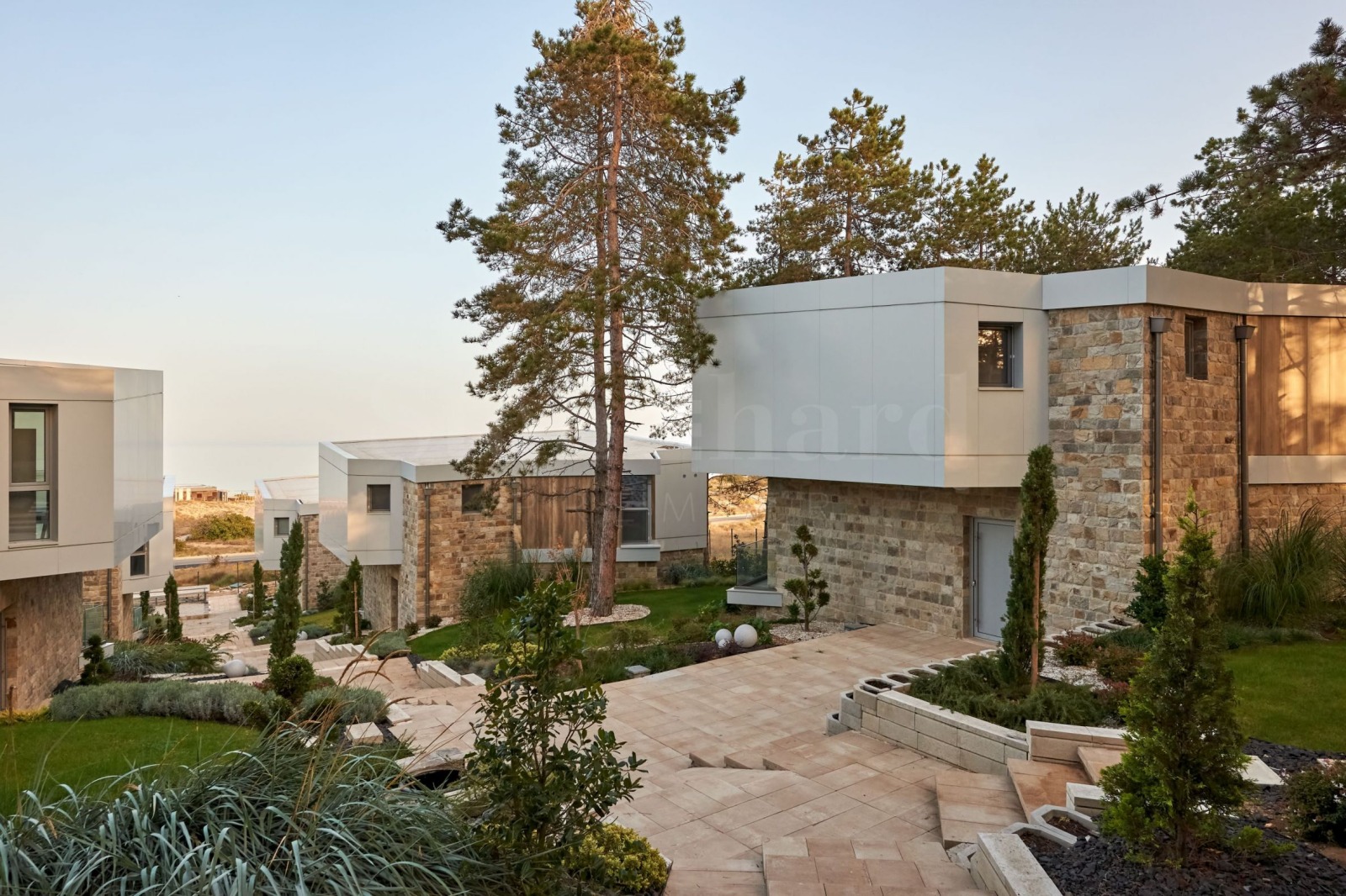 Комплексът има ограда, като достъпът ще се осъществява посредством автоматична бариера. Паркирането ще се извършва в долната част на комплекса, а достъпът до къщите е по централна алея, с предвидени рампи за удобно придвижване. В горната част, където комплексът е тих и обгърнат от боровата зеленина, е предвиден кът за релакс и детски съоръжения, за игри за цялото семейство, барбекю и зона за хранене и забавление на открито, с приятни гледки към морето. Дворното пространство ще бъде озеленено и ще се допълва с ефектно осветление.