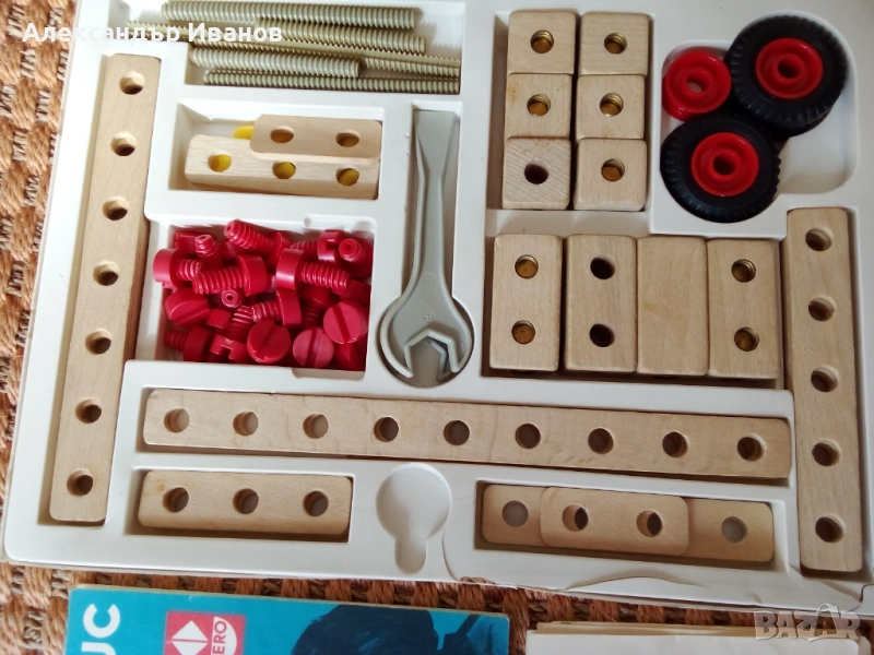 Конструкторът се състои от дървени и пластмасови елементи.Има упътване на немски и руски.Размери на кутията 27/38 см.Дъното на кутията е в лошо състояние,лепено е с тиксо.