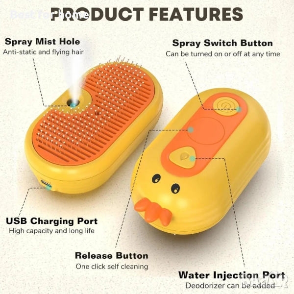Революционен груминг: Изживейте следващото ниво на грижа за котките с нашата четка за котки със спрей! Иновативният дизайн комбинира четкане и пръскане за безстресова рутина за груминг. Просто напълнете резервоара с вода, натиснете бутона и гледайте как се случва магията!