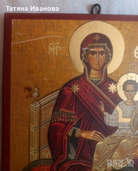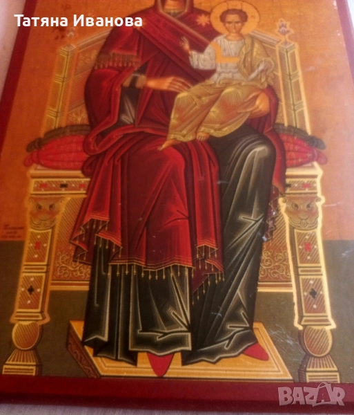Стара Гръцка икона изработена върху дърво изобразяваща Пресвета Богородица „Всецарица“ (Пантанаса). Иконата изобразява Божията Майка, седяща на царски трон с Младенеца Христос в скута ѝ. Този тип икони, наречени Панахранта, са свързани с божествената слава на Мария и концепцията за нейната непорочност. Оригиналната чудотворна икона „Всецарица“ се намира в манастира Ватопеди в Света гора и датира от XVII век. Смята се, че иконата е чудотворна и е известна с изцеленията на тежко болни, включително и раково болни, след молитви пред нея. Надписът "MP" е съкращение от "Матерь Божия" (Майка Божия), а "ОУ К N" (или подобни букви като "ОУ ХС") представлява "О Господи Исусе Христе".Добро състояние за годините си!
