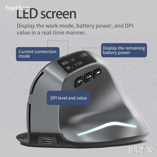 Чисто нова Docooler F-26C 2.4G Безжична Вертикална Ергономична Bluetooth Оптична Мишка, 4 DPI Регулиране 1000/1600/2400/3200 7 Цветни Светлини с LED Екран Подходяща за Геймърски Плейър PC Лаптоп, Сива