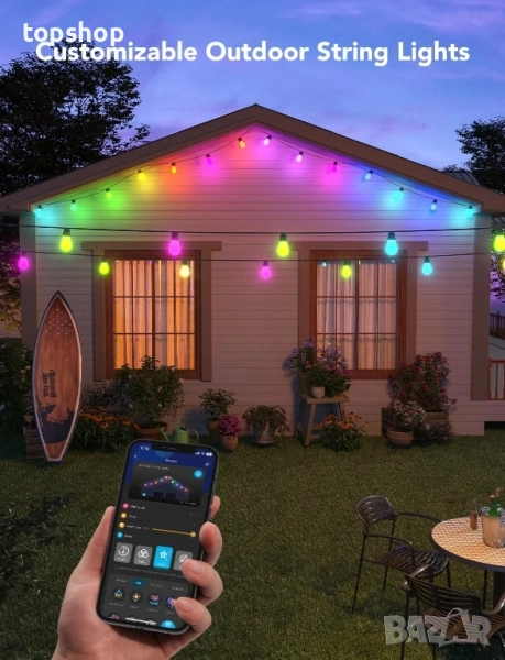 Интелигентно управление чрез приложение: Свържете се с приложението Govee Home чрез Bluetooth за по-разширено управление, за да включите/изключите външната си декорация за тераса, да регулирате яркостта, да променяте цветовете, да задавате режими на сцена и функция на таймера.