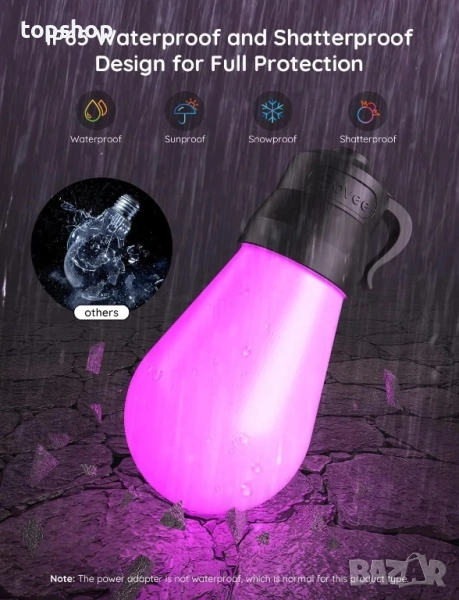 IP65 Водоустойчив и нечуплив: Насладете се на целогодишно интелигентни външни лампи, независимо от времето. Специално проектираните пластмасови външни лампи Govee също са нечупливи, за да издържат на удари и падания. Захранващият адаптер не е водоустойчив.