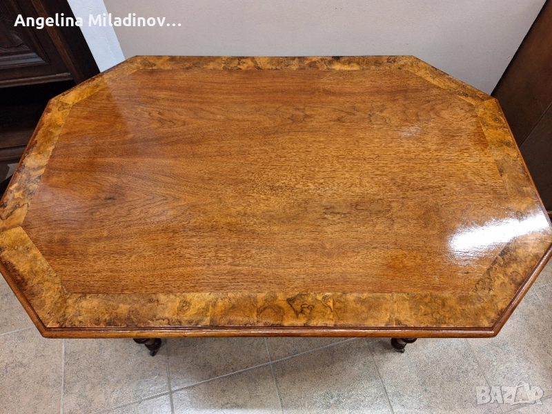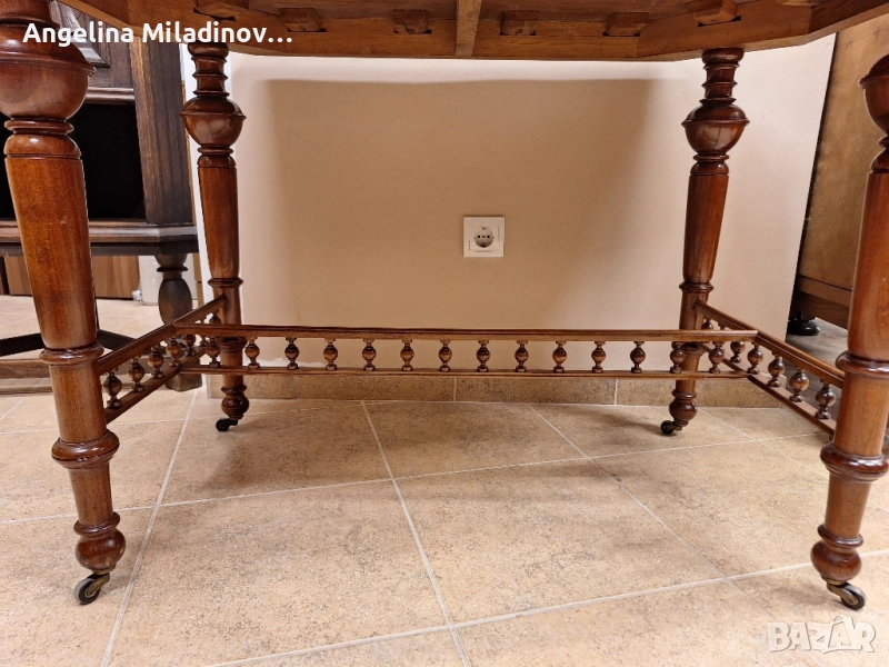 масив с Птичи явор. Масата е елегантна с невероятни елементи, които се пренасят и в столовете и колелца за допълнително удобство. Столовете са тапициряни с висококачествен червен плюш. Комплекта е в отлично състояние. Класа и стил на отминали години, така модерно днес.