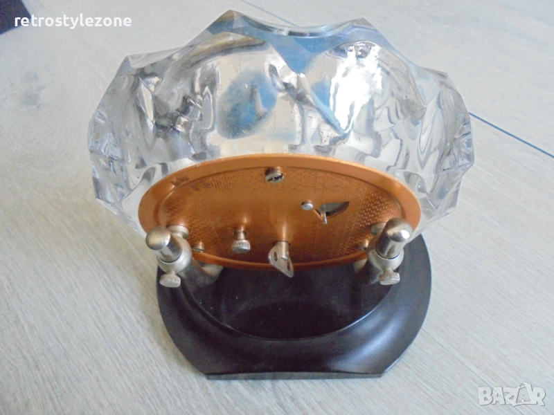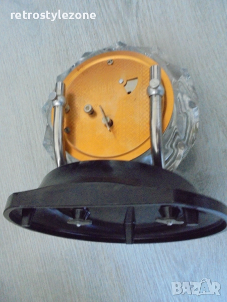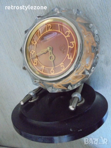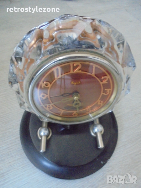 Стар оригинален настолен часовник „Маяк“, механичен с 7-дневен резерв на пружината. Часовникът е изработен с масивен кристален корпус и стилна черна бакелитова основа, характерни за дизайна от средата на ХХ век.