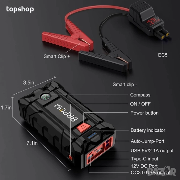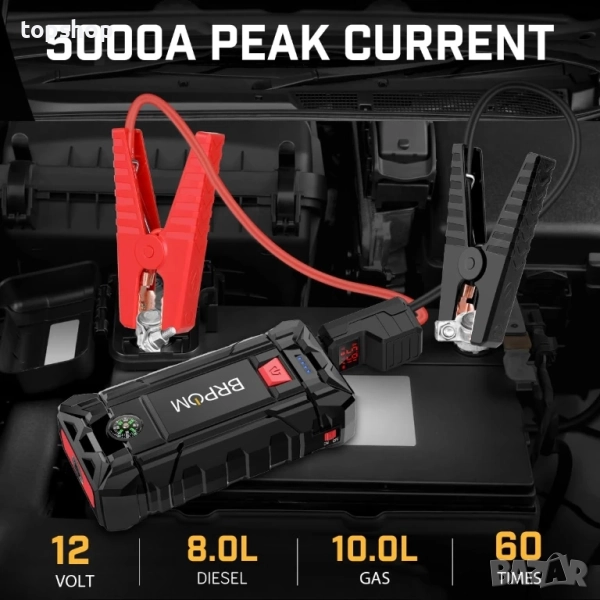 Нов перфектен BRPOM BM3000 Автомобилен стартер, 5000A пик 26800mAh (до 10 л бензинов или 8.0 л дизелов двигател, 50 пъти) 12V автоматичен