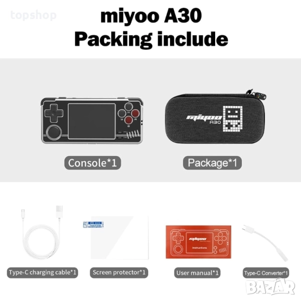Комплектът съдържа: 1x Ръчна игрова конзола Miyoo A30 (черна), 1x Преносим калъф, 1x 64G TF карта, 1x USB-C кабел за зареждане, 1x Четец на карти, 1x Протектор за екран, 1x Ръководство.
