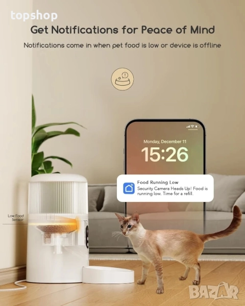 【Изскачащи известия в реално време】Когато детекторът за движение усети промяна в движението, 3MP HD камерата ще записва видеоклипове на дейностите на вашия домашен любимец и вие ще получавате известия за движение в реално време на телефона си. Имате гъвкавостта да регулирате нивото на чувствителност на високо, средно или ниско. За възпроизвеждане на видео просто поставете 128GB SD карта. Изскачащите известия ще ви информират за потенциални проблеми като недостиг на храна (индикиран от вградения сензор за ниско ниво на храна), устройство офлайн, откриване на движение или други проблеми.