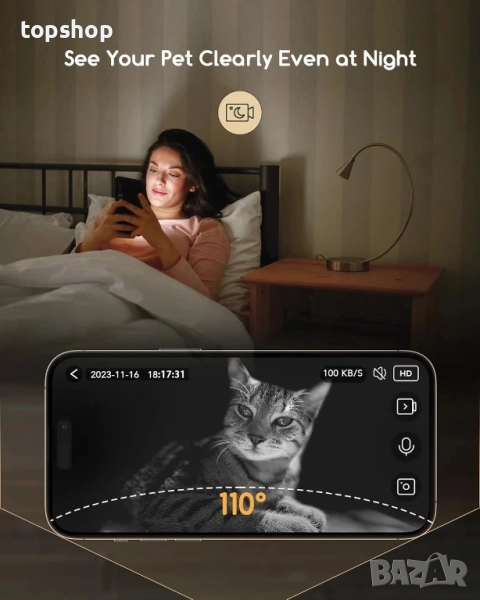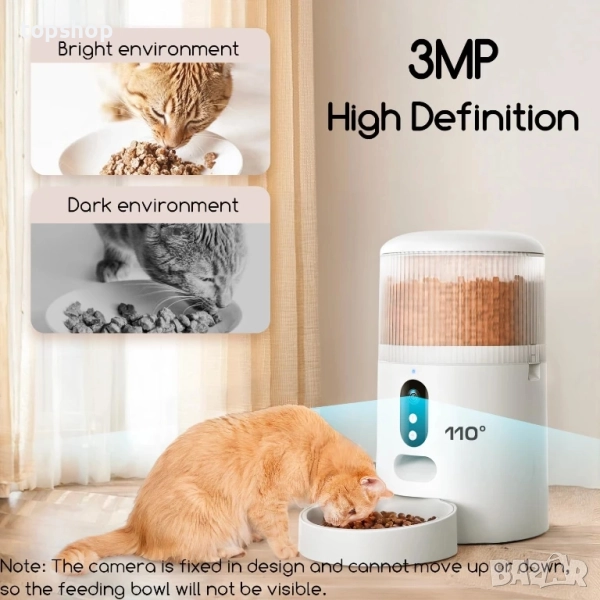 【3MP HD камера с IR нощно виждане】 Оборудвана с 3MP камера с висока разделителна способност и широк ъгъл на видимост от 110°, тази автоматична хранилка за котки с камера ви позволява да наблюдавате любимия си домашен любимец подробно отвсякъде и по всяко време. Освен това, функцията IR нощно виждане ви позволява да заснемате движенията на вашите домашни любимци дори при условия на слаба светлина или през нощта.
