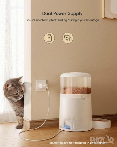 【Капацитет 4 л и двойно захранване】Този интелигентен дозатор за котешка храна може да съхранява до 4 л (16,9 чаши) храна и е съвместим с лиофилизирана храна, суха храна, сушена на въздух храна, с размер на гранулите, ненадвишаващ 10 мм (0,39 инча). Освен това, този диспенсър за котешка храна се предлага с издръжлив USB кабел против ухапване, а можете да използвате и три батерии №1 (не са включени в комплекта) като резервни копия по време на прекъсване на захранването. За да се гарантира свежестта и хрупкавостта на храната за домашни любимци, е включена и вградена торбичка за влагоабсорбатор.