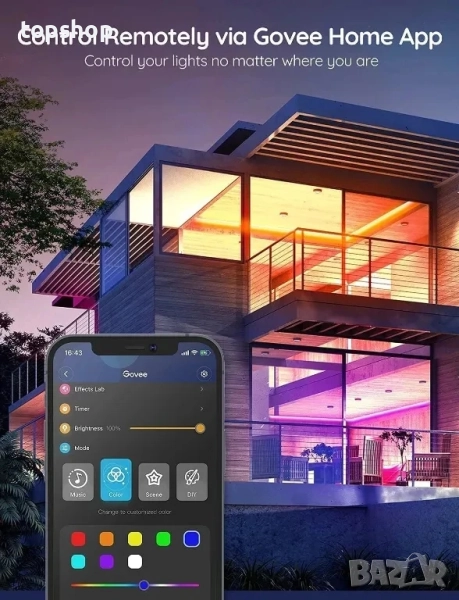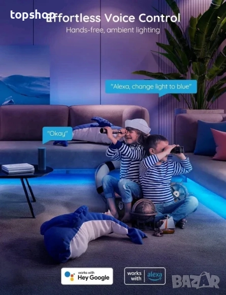 Гласово управление със свободни ръце: Умната LED лента работи както с Alexa, така и с Google Assistant. Освободете ръцете си и включвайте и изключвайте осветлението, променяйте цветовете или регулирайте яркостта с прости гласови команди.
