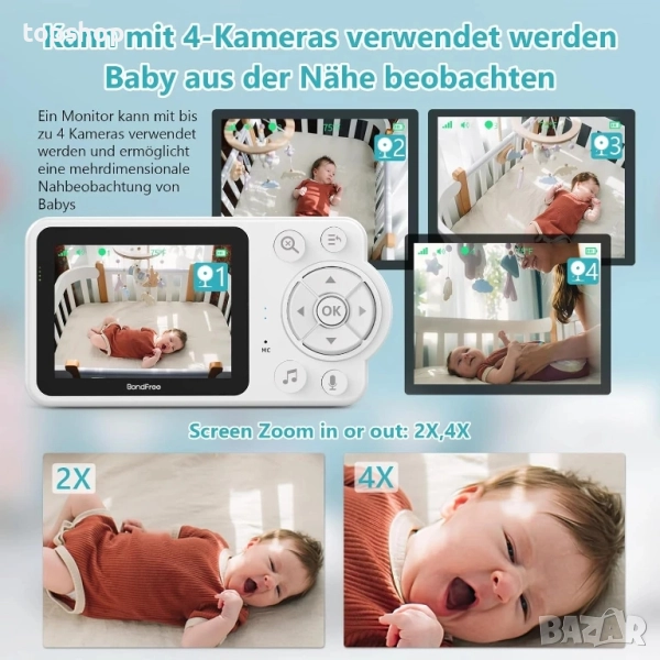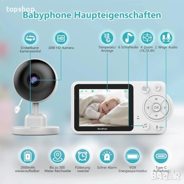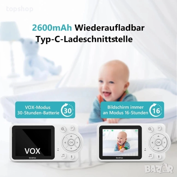ЧИСТО НОВ Бебефон BondFree 2.8”, 300 метра, 2600mAh type C, двупосочен разговор, Vox, нощно виждане