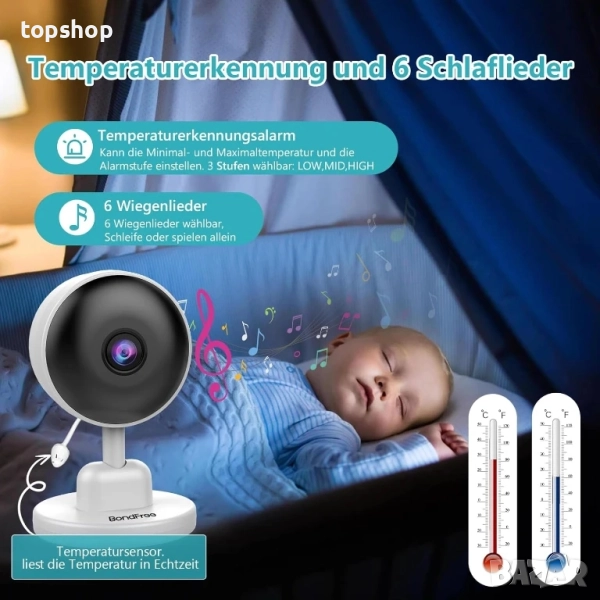 Двупосочен разговор и приспивна песен: Бебефонът BondFree има вградена функция за интерком, независимо дали готвите в кухнята или работите в офиса, функцията за интерком на монитора ви позволява да водите лесен разговор с бебето си и да го накарате да почувства вашата грижа. Ако искате бебето ви да спи спокойно, можете да му четете нежни приспивни песнички (под 6) чрез монитора, като нашият бебефон може да се възпроизвежда циклично или като единична песен.