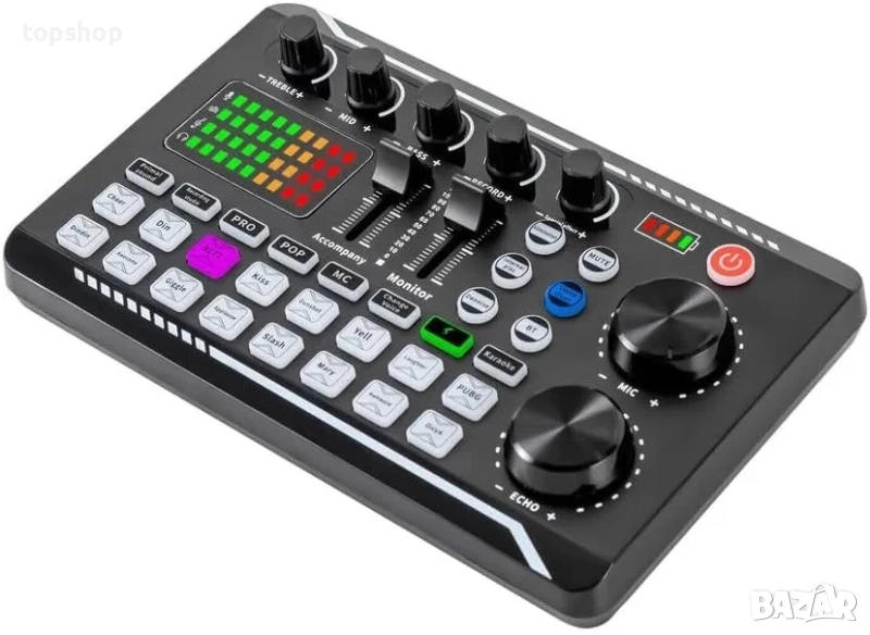 Пълноценно: този комплект звукови карти на живо съдържа почти всички обичайни функции за излъчване, като миксиране, регулиране на високите и ниските честоти, намаляване на шума, акомпанимент, избягване, промяна на гласа и елиминиране на оригиналния звук в песента. В допълнение, миксерът има BT радио връзка, което е много практично.