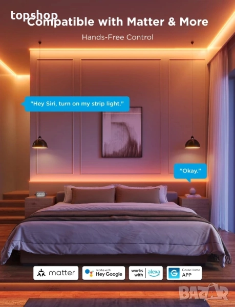 Съвместими с Matter and More: LED лампи, които работят с всички сертифицирани платформи за интелигентен дом, включително HomeKit, Alexa, Google Assistant и други. Управлявайте тези интелигентни LED ленти чрез гласова команда за по-интелигентно изживяване.