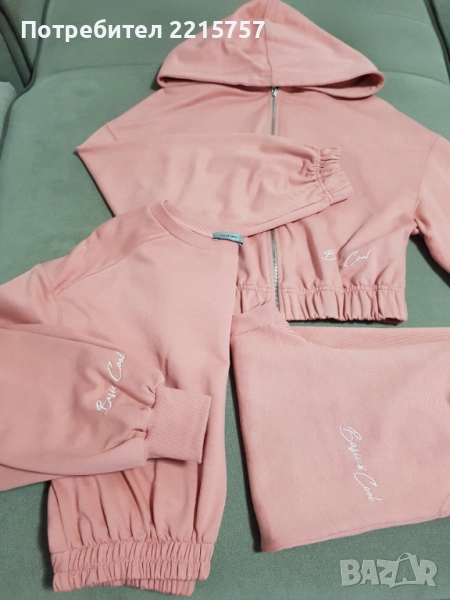 1)Спортен екип. Бледо розов цвят. Горнище със цип и качулка.Размер С-М. Цена 75лв..................................................................................................................2) Допълнителна блуза. Без качулка и цип. Цена 25лв.