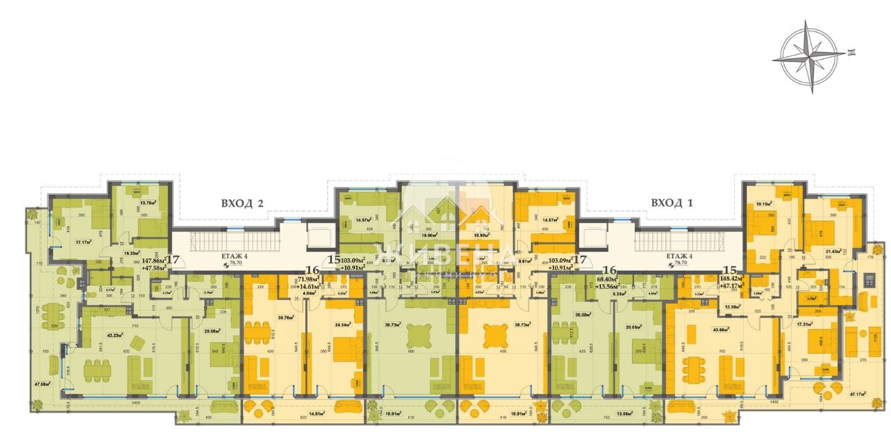Агенция Живена предлага за продажба голям панорамен четиристаен апартамент с гледка към морето с площ 227 кв.м, разположен на 4-ти етаж в 4-етажна сграда в новоизграждащ се комплекс в местност Манастирски Рид. Разпределението на имота е следното: антре (13.4 кв.м), дневен тракт и трапезария (43.38 кв.м), три спални (17.3 кв.м, 19.15 кв.м и 21.43 кв.м),две бани с тоалетна (4.7 кв.м и 4.3 кв.м), перално помещение/килер (2.88 кв.м) и просторна тераса (47 кв.м). За комплекса: в луксозния жилищен комплекс ще бъдат изградени четири елегантни сгради, разположени на парцел с площ от 15 декара. Сградите са четириетажни и ще се отличават с модерен дизайн и прецизно изпълнение, което гарантира комфорт и удобство за всеки обитател. Всяка сграда е проектирана с внимание към детайла, така че да се впише естествено в околната природа, в съчетание с най-новите технологии за строителство, което осигурява висока енергийна ефективност и устойчивост. Терасите и лоджиите на апартаментите са проектирани така, че дори от първите етажи се разкрива директна морска гледка. Жилищният комплекс ще бъде с контрол на достъпа и денонощна охрана. Ще бъдат осигурени и всички съвременни удобства за цялото семейство, включително басейн на три нива, обграден от зеленина и простор, на територия от 1 декар, с изключителна гледка към морето. Детските съоръжения, зонирани по възраст и изградени от естествени и еко материал. Има избор на апартаменти и може да се закупи паркомясто на цени от 18 300 евро и гараж на цена започващи от 23 000 евро. Комплексът се намира в един от най-живописните и магнетични райони в близост до град Варна местност Манастирски рид. Комплексът е ситуиран в сърцето на величествена дъбова гора, само на няколко минути пешеходно разстояние от плажа на курортен комплекс Слънчев ден, известен със своите чисти води и широка пясъчна ивица. Агенция Живена извършва необходимите проверки на имота, който сте избрали, организира всички етапи на сделката до нейното финализиране. Оказваме съдействие за отпускане на банков кредит. Оферта 7447