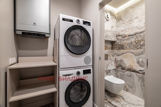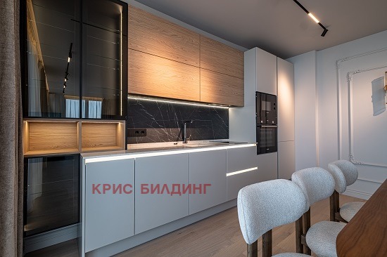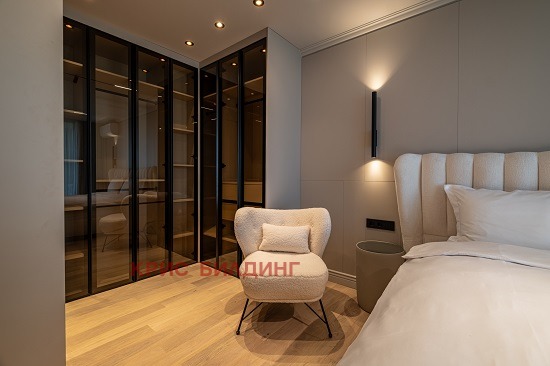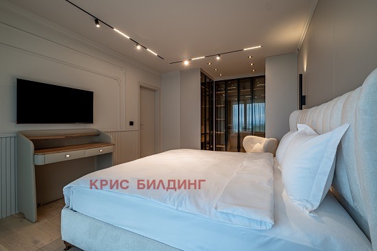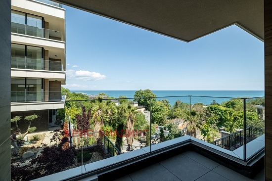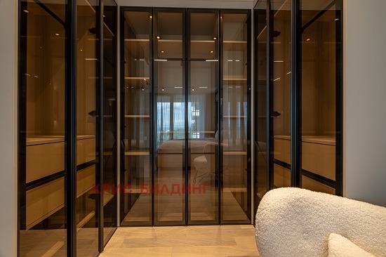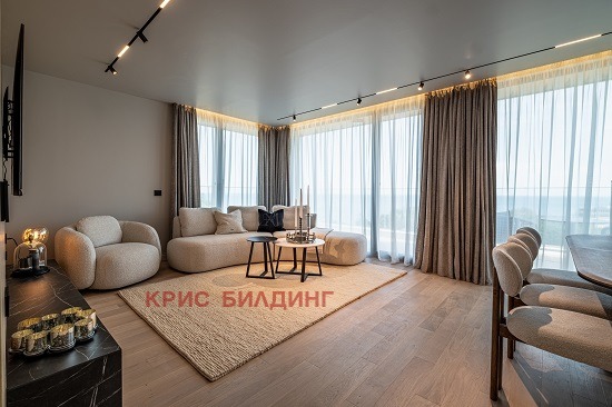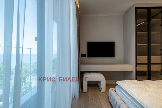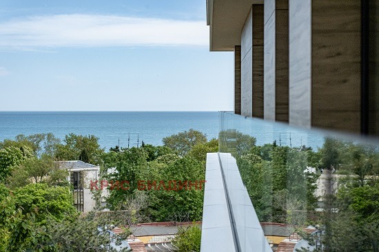 Апартаментът е с площ 180 кв.м. Състои се от функционален коридор с перално/килер, голям и слънчев дневен тракт с кухненска част с площ 35 кв.м. с излаз на панорамна тераса с нескриваема морска гледка, родителска спалня с гардеробна, с площ 25кв.м. и изход на самостоятелна тераса, две спални, просторна баня с тоалет, тоалет. Апартаментът се предлага напълно обзаведен и оборудван с висок клас електроуреди и мебели. Интериорът е модерен и стилен, меки пастелни тонове, с луксозни и елегантни акценти. Атмосферата е изключително комфортна и уютна, носи усещането за изисканост и стил. Всички умело подбрани дизайнерски решения и изпълнения са на доказала се фирма за интериорен дизайн.