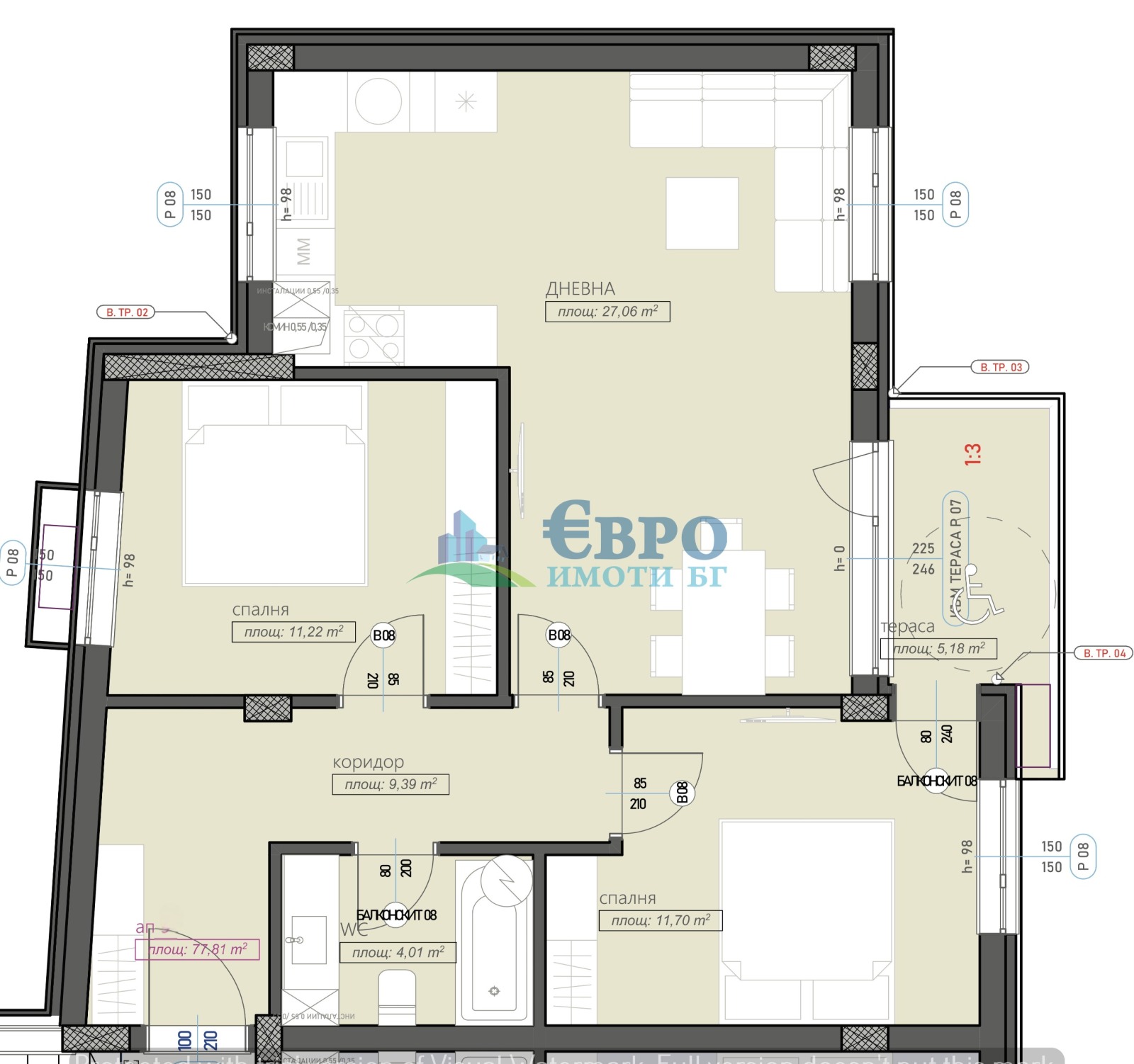 Просторен, ТРИСТАЕН АПАРТАМЕНТ с две изложения и функционално разпределение без преходи или загуба на квадратура. Широка ВСЕКИДНЕВНА с кухненски бокс, правилна форма, прозорци с естествена светлина от две посоки и площ от 27 кв.м., ДВЕ самостоятелни СПАЛНИ в стандартни размери, излаз към тераса от всекидневната и едната спалня, антре, баня с WC и голямо мазе със застроена площ от 6.8 кв.м.