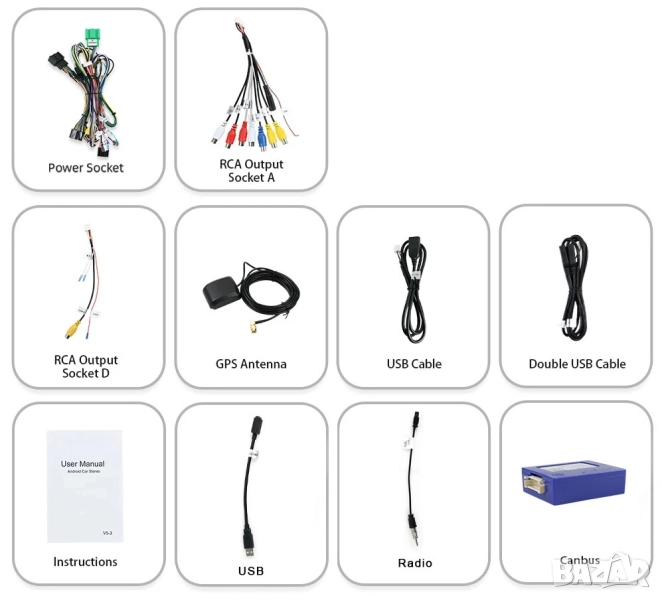 Пълен комплект с цялата рамка, преходни кабели и букси, декодери, предназначени и съвместими за монтиране на конкретния модел автомобил.