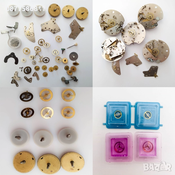 Разполагаме с богат набор от части за механични и кварцови часовници, будилници, стенни часовници: Стъкла, Баланси, Оси, Ремонтоари, Коронки, Анкери, Пружини, Колелета, Колела Уплътнения за заден капак, Уплътнители, Патенти и др.