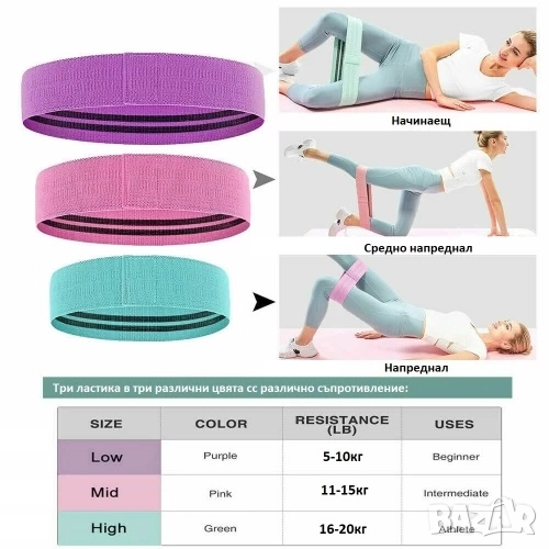 В комплекта ще откриете 3 броя ластици с различно съпротивление - даващи възможност за силова прогресия при чести тренировки.