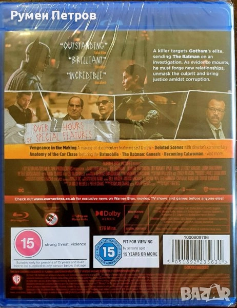 Продавам блу рей екшъна БАТМАН 2022 - THE BATMAN - Blu Ray - чисто нов неразпечатан блу рей специално издание в 2 диска, втория диск съдържа над 2 часа допълнителни материали и екстри за филма, ИМА БГ субтитри - филма е внос от Англия