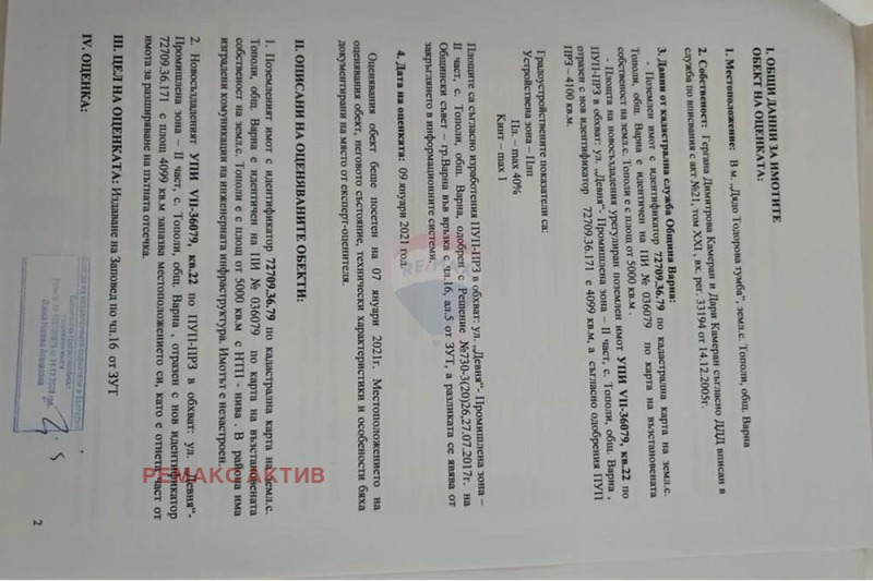 Имотът е свободен от застрояване и правни тежести, с ясно установена собственост, подходящ за незабавно започване на проектантски и инвестиционни дейности. Пространственото му разположение и достъпът до транспортна и комунална инфраструктура го поставят сред най-търсените имоти в рамките на Западна промишлена зона Варна.