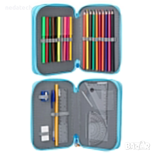 Тюркоазен училищен несесер с дизайн на Stumble Guys. Съдържа молив и син химикал, синя пластмасова острилка, гумичка, права линийка 15 см, триъгълник и транспортир 10 см, 10 цветни молива и 10 маркера.