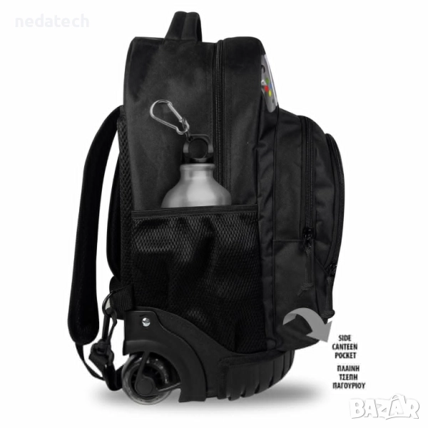 Раница в черно с дизайн на геймърска фигурка. Разполага с 1 голямо отделение и 2 големи предни джоба с органайзер в 1 от 2-та. Има черен цип и 2 странични джоба с мрежа. С външен мрежест джоб за лаптоп на гърба, с Т-образна дръжка до 77 см, високоздрави колела, опорна основа и меки презрамки със светлоотразители.