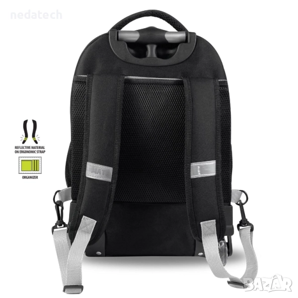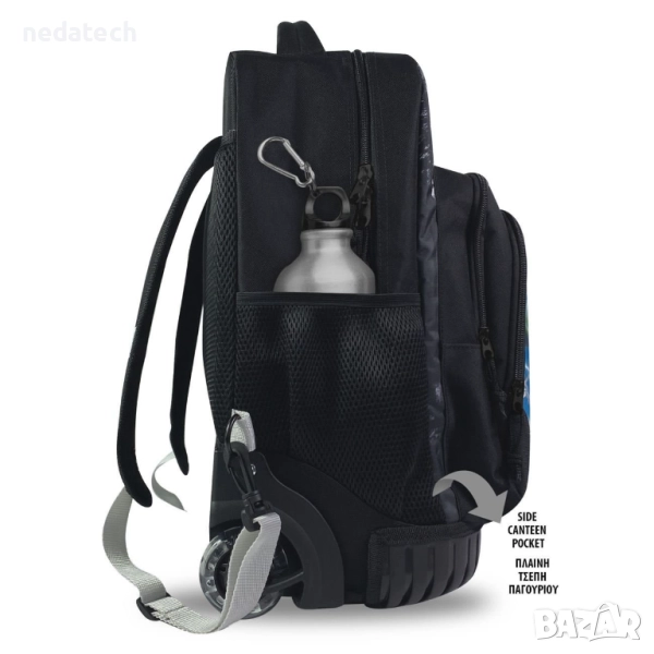 Несесер в черно с дизайн на динозавър. Разполага с 2 големи отделения и 1 голям преден джоб с органайзер. Има черен цип и 2 странични джоба с мрежа. С Т-образна дръжка до 73 см, високоздрави колела, опорна основа и меки презрамки със светлоотразители.