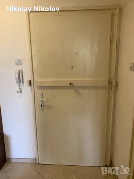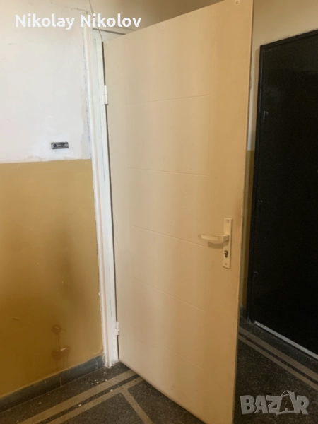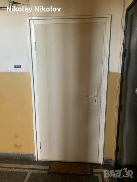 Масивна входна врата в бял цвят. Вратата е комбинирана с облицована метална врата и заключващо рамо. Състоянието е много добро и е подходяща за жилищни или офис помещения. Размерите са 202 х 90 х 38. Дебелината на металната врата е 4 см.
