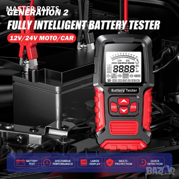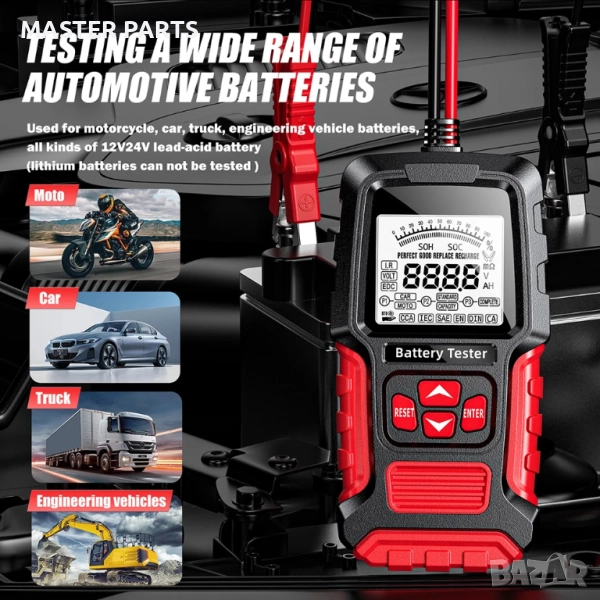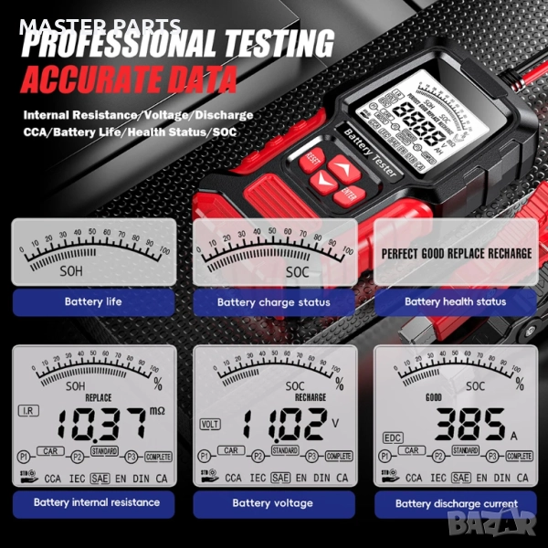 Тестерът предоставя бърз и надежден анализ на акумулатора, като показва основни параметри като SOH (състояние на здравето),