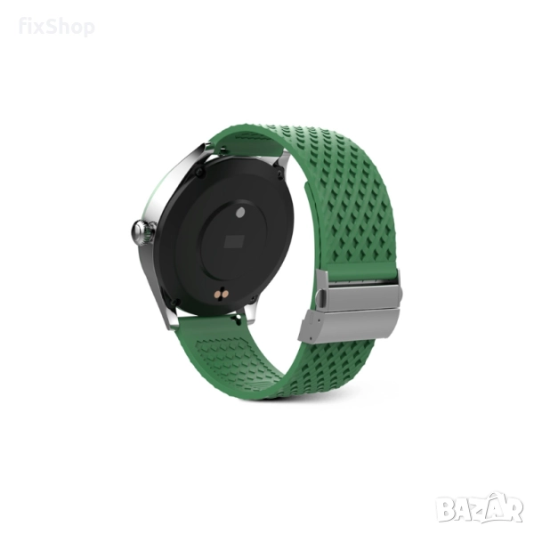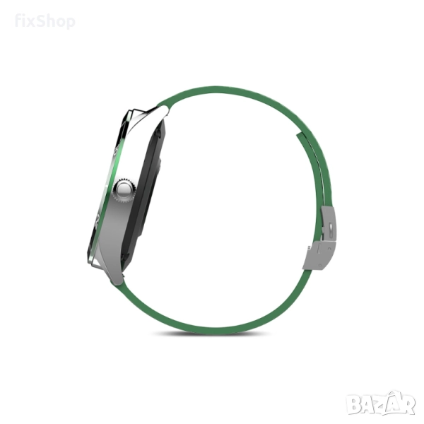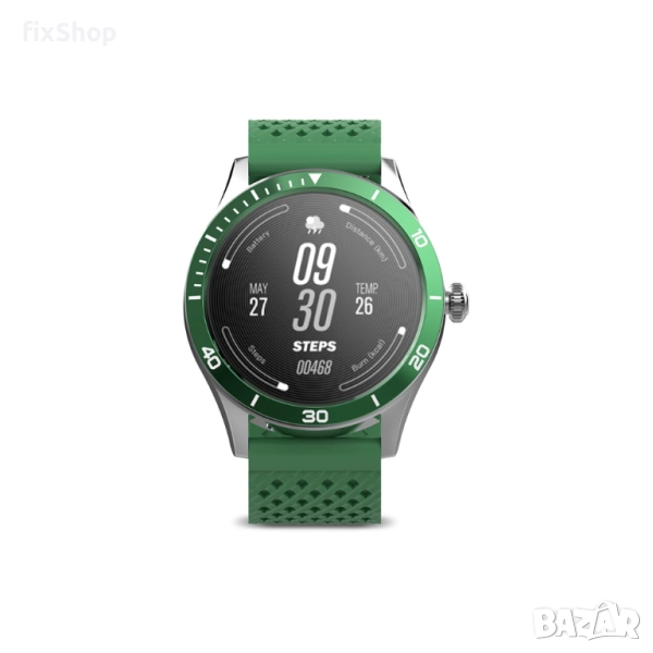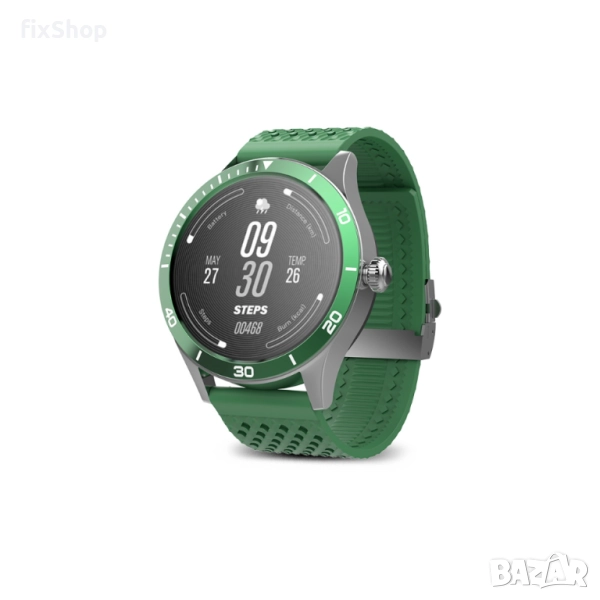 Дизайн: алуминиев корпус, силиконова каишка в стилен зелен цвят