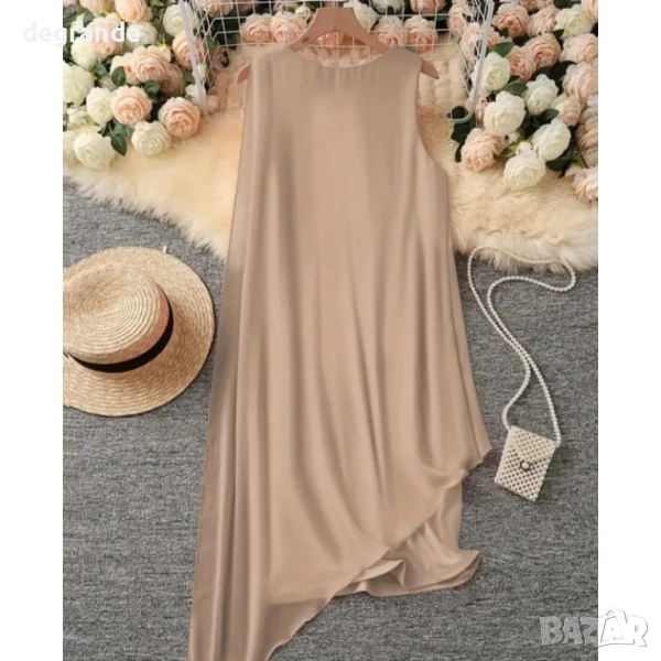 дамска елегантна рокля права без ръкави с асиметрична гарнитура от шифон