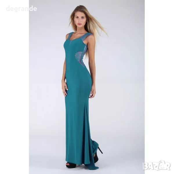 красива бална рокля в изумрудено зелено с вграден бродиран тюл с дребни пайети с лек блясък