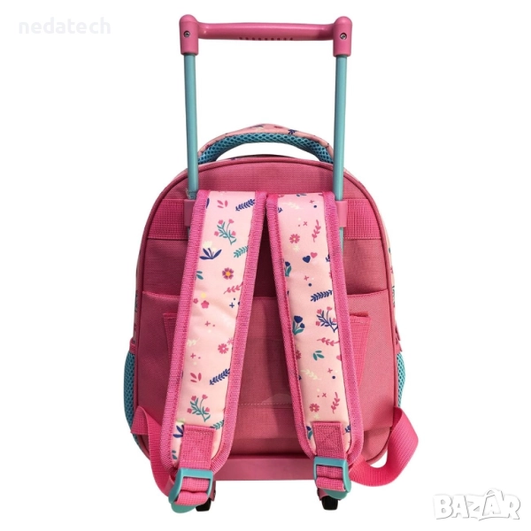 Раница с 1 отделение, с 1 голям джоб, 2 мрежести джоба отстрани за бутилка с вода в светло син и розов цвят и 3D дизайн на Мини със сърца, пеперуди и цветя. Има външен езичек на гърба за детайлите на детето, здрави ципове, регулируеми презрамки и P-образна дръжка с височина до 58 см.