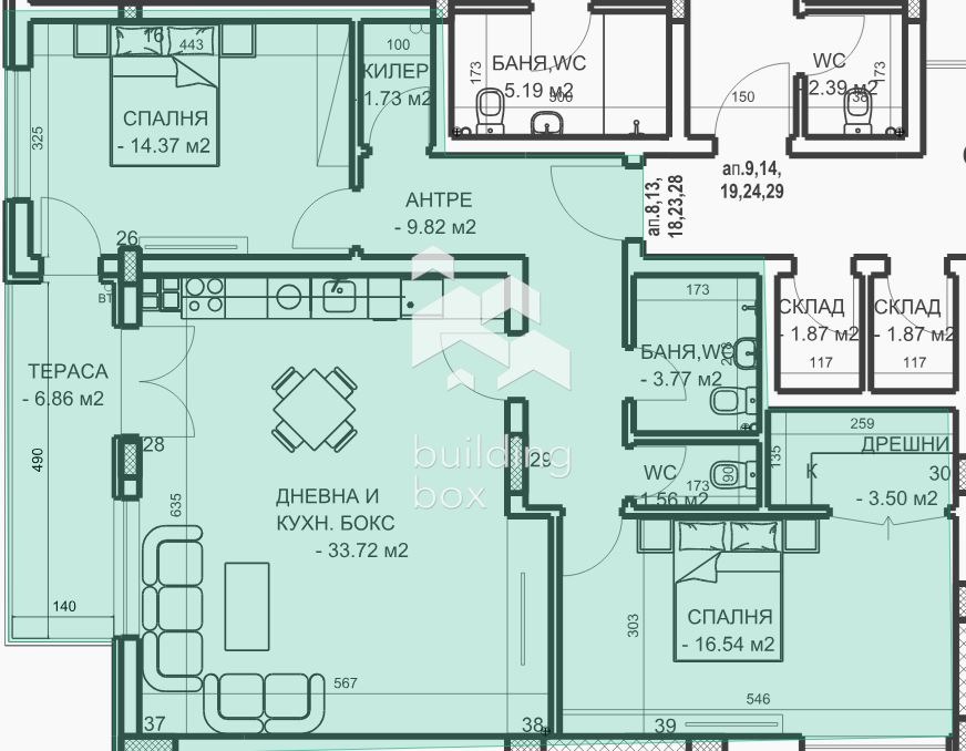 - РАЗПРЕДЕЛЕНИЕ: Просторна всекидневна с кухненски бокс с площ от 33,72 кв.м., родителска спалня с площ от 16,54 кв.м. и дрешник към нея с площ от 3,50 кв.м., втора спалня с площ от 14,37 кв.м., антре, баня с тоалетна, отделна тоалетна, килер и тераса.