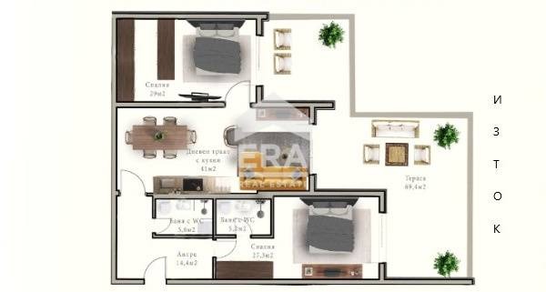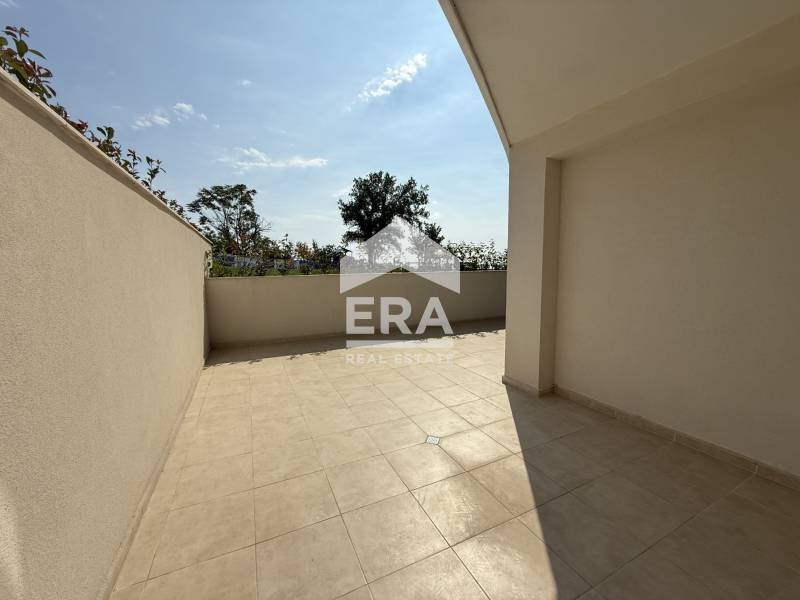 ЕРА Варна Тренд предлага за продажба тристаен апартамент със застроена площ 189,6 кв.м (213,49 кв.м с общите части), разположен на първи партерен етаж, със собствена зигзагообразна тераса/веранда (69,4 кв.м). Имотът се състои от входно антре (14,4 кв.м), просторна дневна с кухненски бокс и трапезария (41 кв.м), преходна спалня (29 кв.м) с дрешник, втора спалня (27,3 кв.м) с дрешник и собствена баня с тоалетна (5,2 кв.м), и още една баня с тоалетна (5,6 кв.м). Всички стаи са с излаз на терасата. Височината на таваните е 3.5 м. Изложението е изцяло изток. Открива се морска панорама.