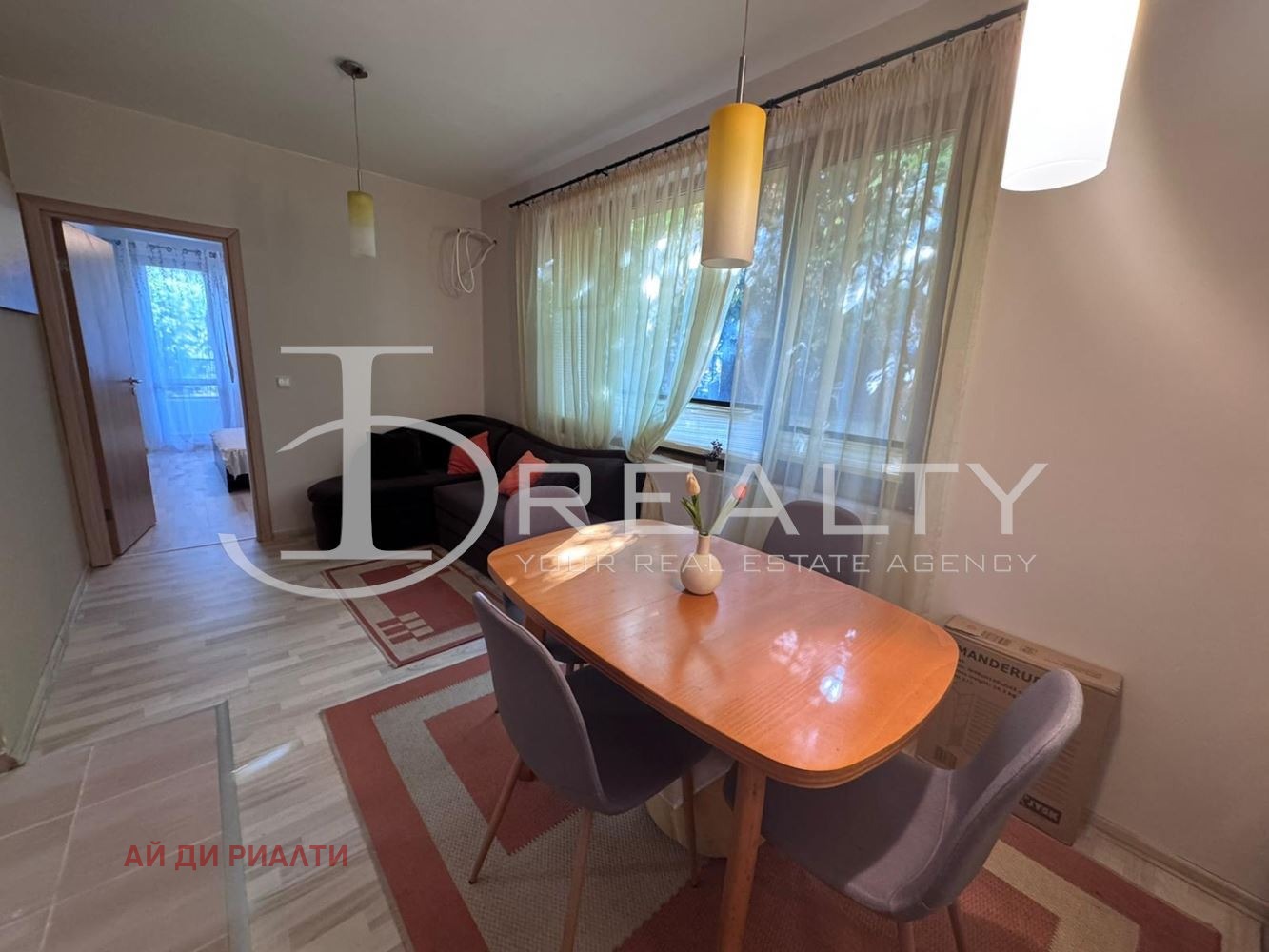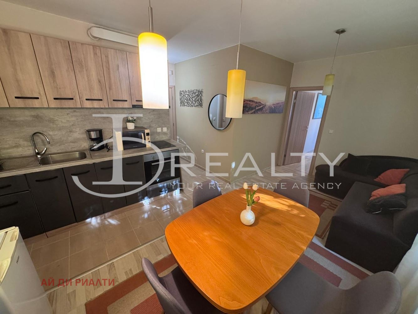 ID Realty има удоволствието да Ви представи обзаведен двустаен апартамент на петдесет метра от плажа в с. Равда. Апартаментът се състои от антре, всекидневна с кухненски кът, спалня, баня със санитарен възел и тераса. Издава се обзаведен с наличните мебели и техника. Жилището се намира в жилищна сграда без асансьор и без такса поддръжка. Подходящ е както за целогодишно живеене, така и с цел инвестиция за отдаване под наем.