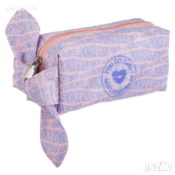 Несесер от серията Miss Lemonade, в лилаво-сьомга с нежно лого или синьо-лилаво с цветен принт. Имат плат по ръба, който можете да завържете по различни начини. Има метален цип. Идеален за ученици от началното училище и тийнейджъри.
