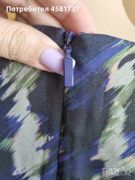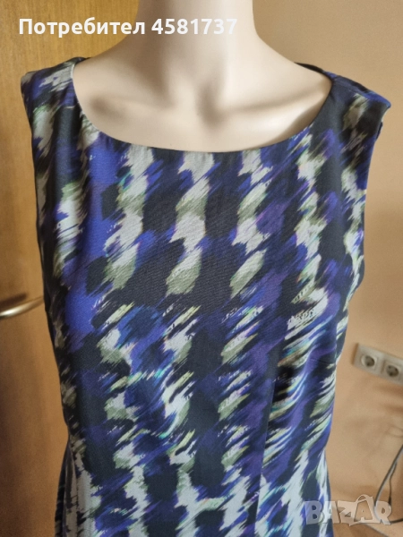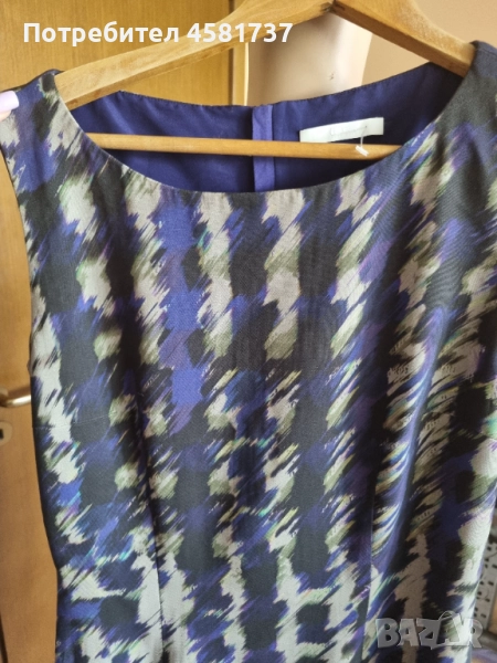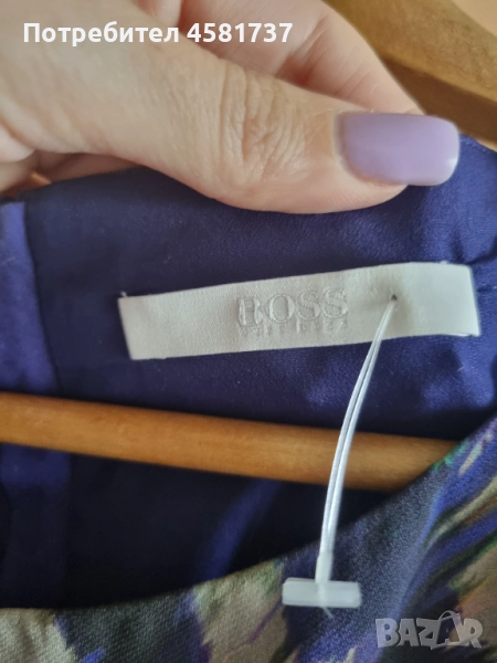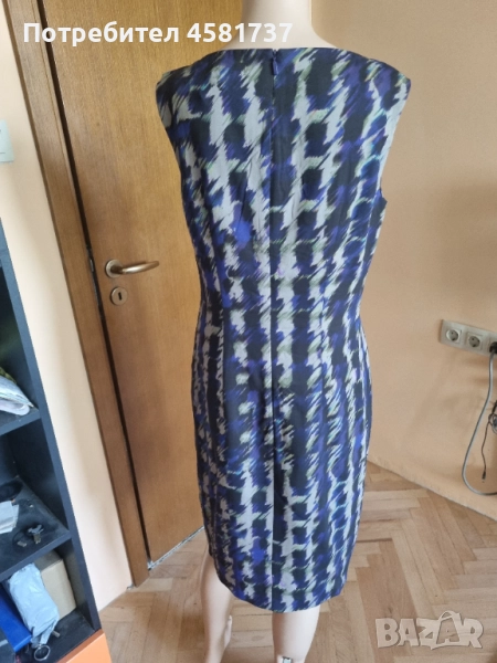 Рокля на Hugo Boss, следваща класическата, изчистена делова линия, но със запомнещ се в десен в лилавата гама. Изцяло подплатена с лилава подплата. Закопчване на гърба, брандиран цип. Следваша извиките на тялото, миди дължина. Подходяща за високи дами.