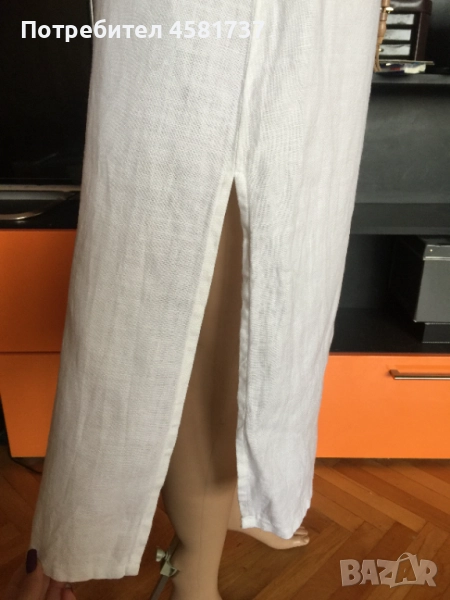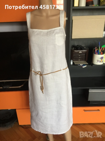 тип сукман на Benetton. Роклята е изработена от най-подходящата за топлите дни материя-лен. Ленът е плътен и качествен. Детайли:широки презрамки, малко кокетно джобче отпред и дълбока цепка отдясно, фино коланче от велур за подчератване на талията, Роклята носи много лежерно настроение, усещане за лято, море и релакс. Универсален избор за лятото. Спокойно може да се носи и над бански за плажа.