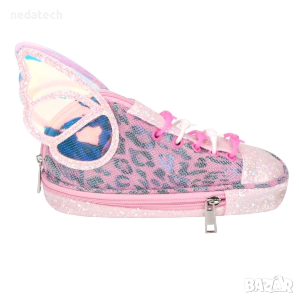 Несесер с цип, 2 отделения, розова обувка с преливащи се крила на пеперуда, розов преливащ брокат и розов животински принт. Долното отделение на дъното е с размери 22x8x4 см, а горното отделение е със силиконови връзки и е с размери 22x8x9 см. Идеална за ученици от началното училище и тийнейджъри.