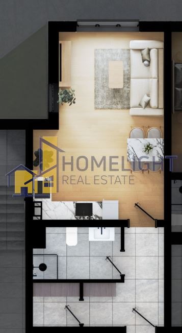 Разпределение: антре, всекидневна с кухненски бокс, , санитарен възел и склад.