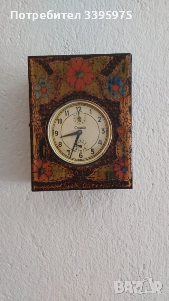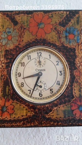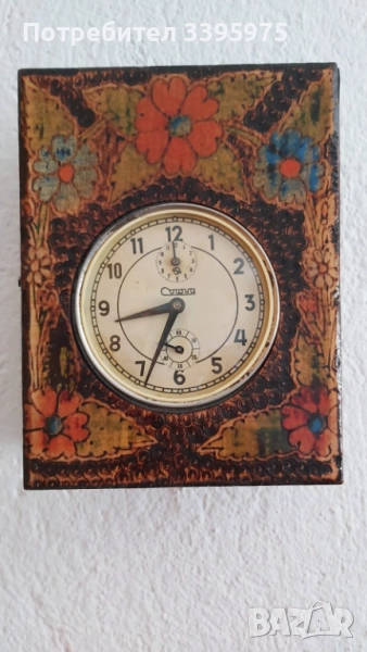 Рядък екземпляр на часовник, произведен в България ”София”, в декоративна дървена кутия с ръчно рисуване в битов стил. Часовникът ”София” е рядкост. Произведен през 60-те години на миналия век. Механизъм с аларма и секундна скала. Напълно работещо състояние. Има колекционерска и антикварна стойност. Отличен вариант за колекционери или като интериорен елемент в ретро стил.